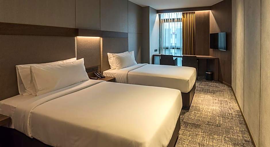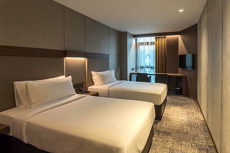 Furnished with warm tones, this air-conditioned twin room features a private balcony that opens up to views of the city. It is fitted with a flat-screen IPTV, a mini refrigerator and a safe. A writing desk with an Italian-made dress chair is available for your convenience. The private bathroom includes a standing shower and a hairdryer. Complimentary bottled water and tea/coffee facilities are replenished daily.