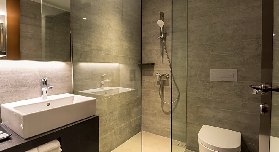 Furnished with warm tones, this spacious air-conditioned family room opens up to views of the city. It is fitted with a flat-screen IPTV, a mini refrigerator and a safe. A writing desk with an Italian-made dress chair is available for your convenience.The private bathroom includes a standing shower and a hairdryer. Complimentary bottled water and tea/coffee facilities are replenished daily.