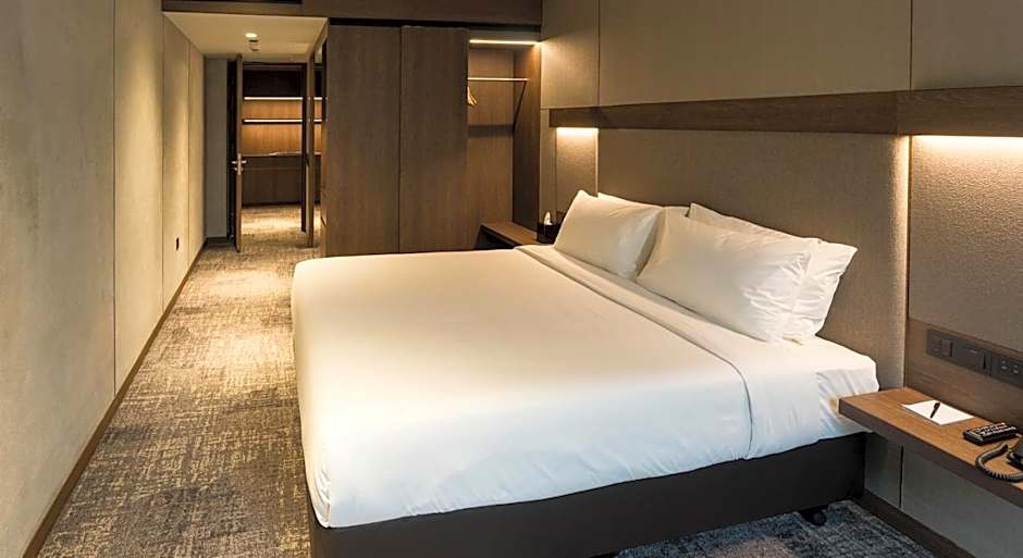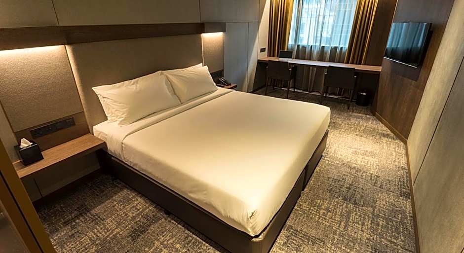 Furnished with warm tones, this air-conditioned king room opens up to views of the city. It is fitted with a flat-screen IPTV, a mini refrigerator and a safe. A writing desk with an Italian-made dress chair is available for your convenience. The private bathroom includes a standing shower and a hairdryer. Complimentary bottled water and tea/coffee facilities are replenished daily.